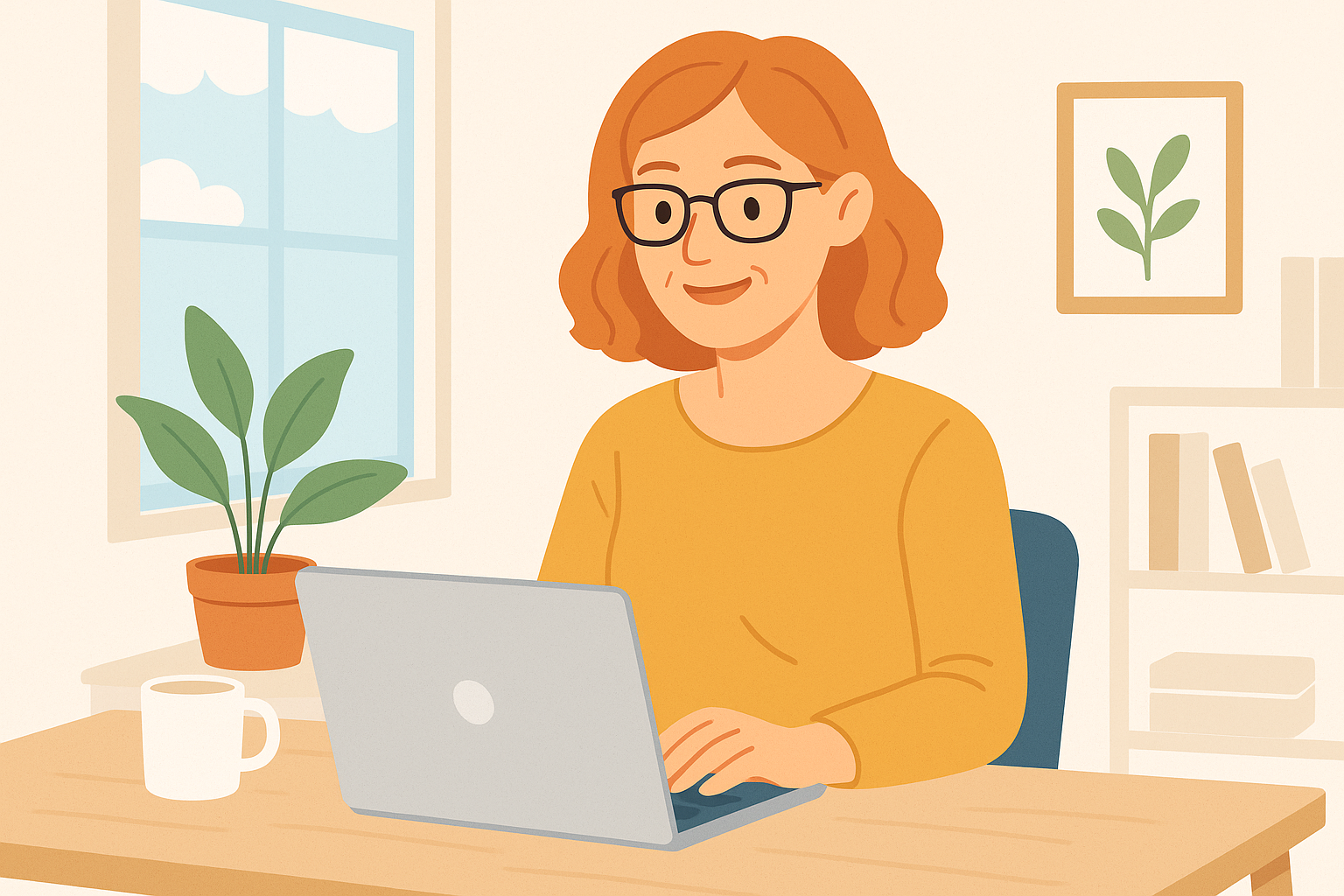 A bright and friendly illustration of a woman in her 40s working from home on her laptop, with a clean and modern aesthetic. The style should be simple and inviting, suitable for a blog's featured image.
